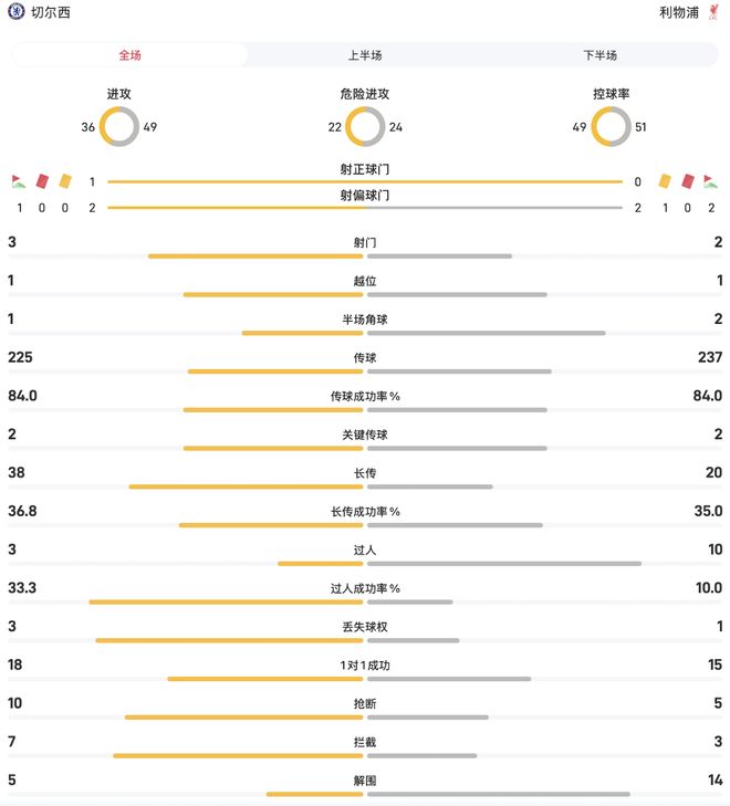 切尔西vs利物浦半场数据:红军半场0射正,控球率五五开